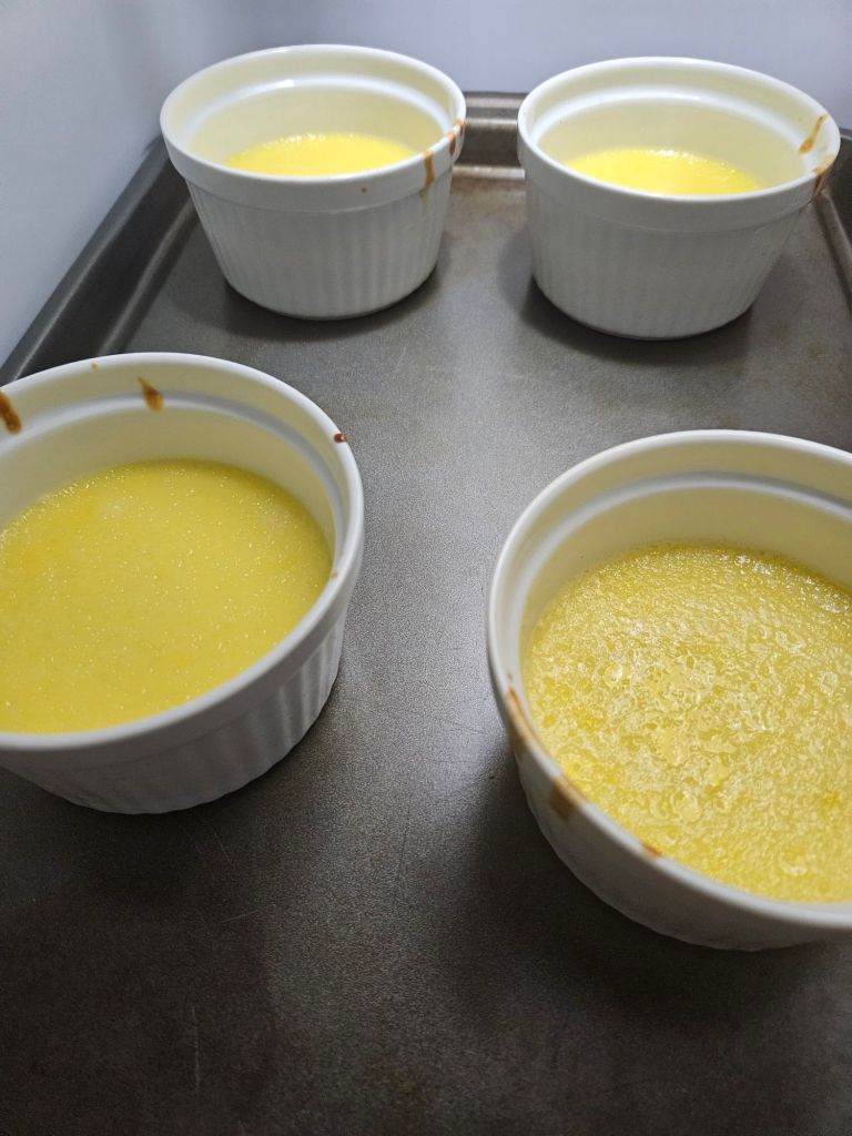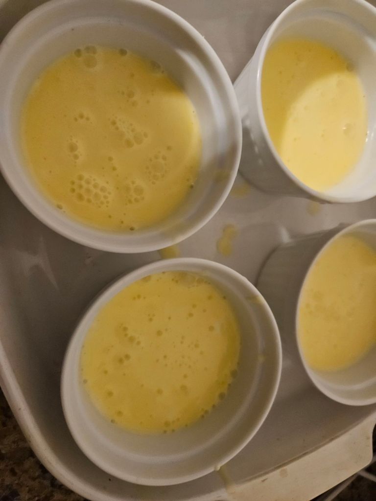 Your next step will be to add the egg mixture to your heated cream while being careful to stir it at a steady pace. Once all the mixture is together, pour it all evenly into your ramekins about 3/4 of the way to the top. Afterward, fill your baking container with hot water until it covers 3/4 of the ramekins from the outside.