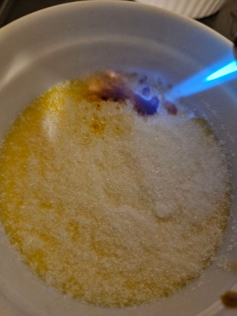 Once the custard has reached room temperature. Refrigerate for about 2 hours. Once chilled, remove the custard from the fridge and apply an even layer of sugar to all the ramekins on top of the custard. Once coated with the sugar, torch the tops of the custard with a butane torch/cooking torch until the sugar has been rendered carmalized