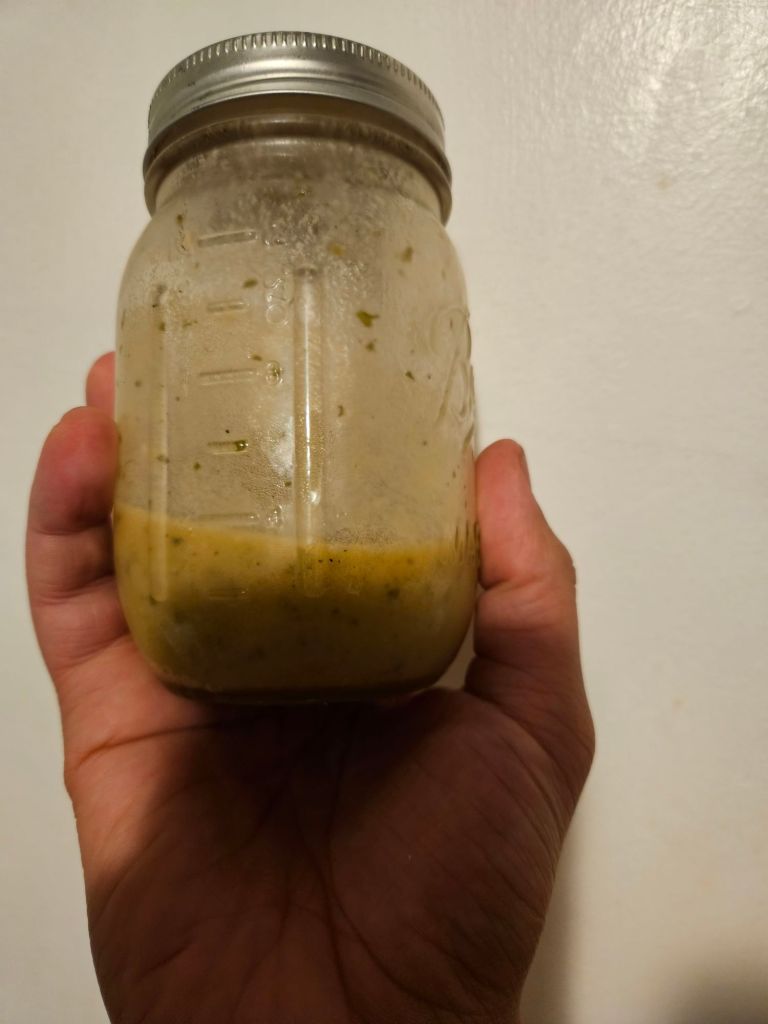Once you round up your ingredients, you’ll need to get one mason jar to put in all dry and wet ingredients. Once all ingredients are in the jar, vigorously shake the jar to mix your ingredients, and you are ready to serve. This makes roughly 1/4 of a mason jar full of dressing. You can add more as you see fit.