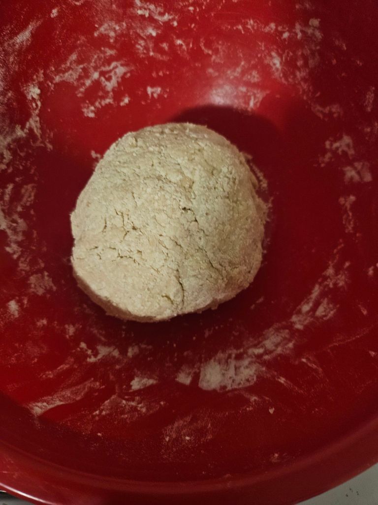 Once the dry ingredients are done the water should be nice and hot. Pour the water into the bowl and mix around until the flour is fully incorporated into the mix and form it into a ball.