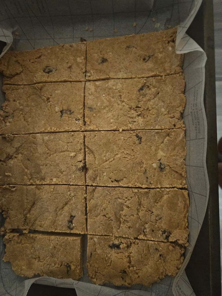 To make this you will want to mix the protein powder and almond flower together in a bowl. Once mixes melt down the almond butter. Pour the melted almond butter into the bowl with the dry mix. Add the maple syrup and incorporate the rasins. Mix until all ingredients are fully incorporated. Take mixture and place into a lined pan ( the shallower the pan the thinner the bars will be) and flatten out. Once flattened, placs the pan into the fridge to cool for an hour and cut into 12 pieces with a wet knife.