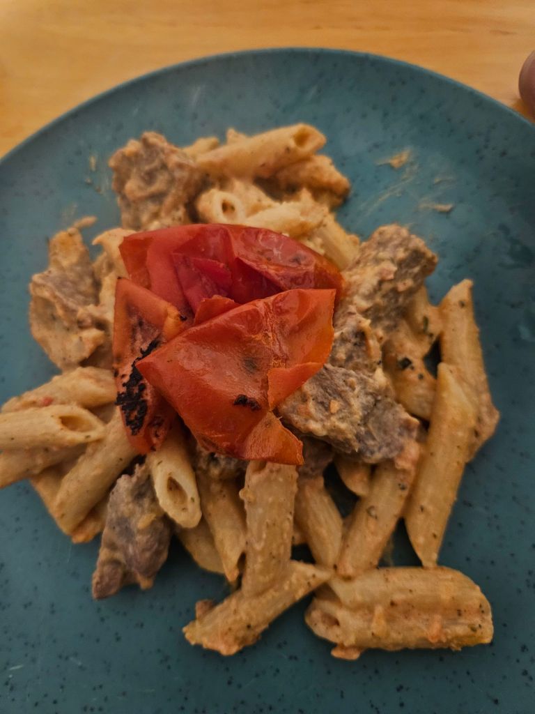 Once the steak is cooked,  cut it into small bite sized pieces and mix into the pasta. Afterward, heat your heavy whipping cream and add your tomato puree and stir in garlic and onion powder, itallialn seasoning, basil and pepper to add more flavor. Stir until color changes and to desired taste. Pour the sauce into the pasta and heat on a low simmer stirring the pot to blend it all together. Place onto a place and add some of the charred tomato skins and serve!